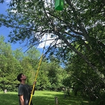 Pour surveiller la propagation de l'agrile du frêne, le Conseil des espèces envahissantes du Nouveau-Brunswick a travaillé avec des agences gouvernementales telles que l'Agence canadienne d'inspection des aliments (ACIA), des municipalités et d'autres organisations à but non lucratif pour installer des pièges à prisme afin de surveiller la présence de l'agrile du frêne. Ces pièges sont suspendus aux arbres et appâtés avec l'odeur des frênes et des phéromones femelles de l'agrile du frêne, ce qui attire les insectes qui sont ensuite capturés par le revêtement extérieur collant du piège. L'objectif de ces pièges n'est pas de capturer tous les agrile du frêne, mais plutôt de surveiller passivement leur présence afin que nous puissions mieux comprendre leur propagation et la densité de leur population à l'intérieur et à l'extérieur des zones réglementées par l'ACIA.